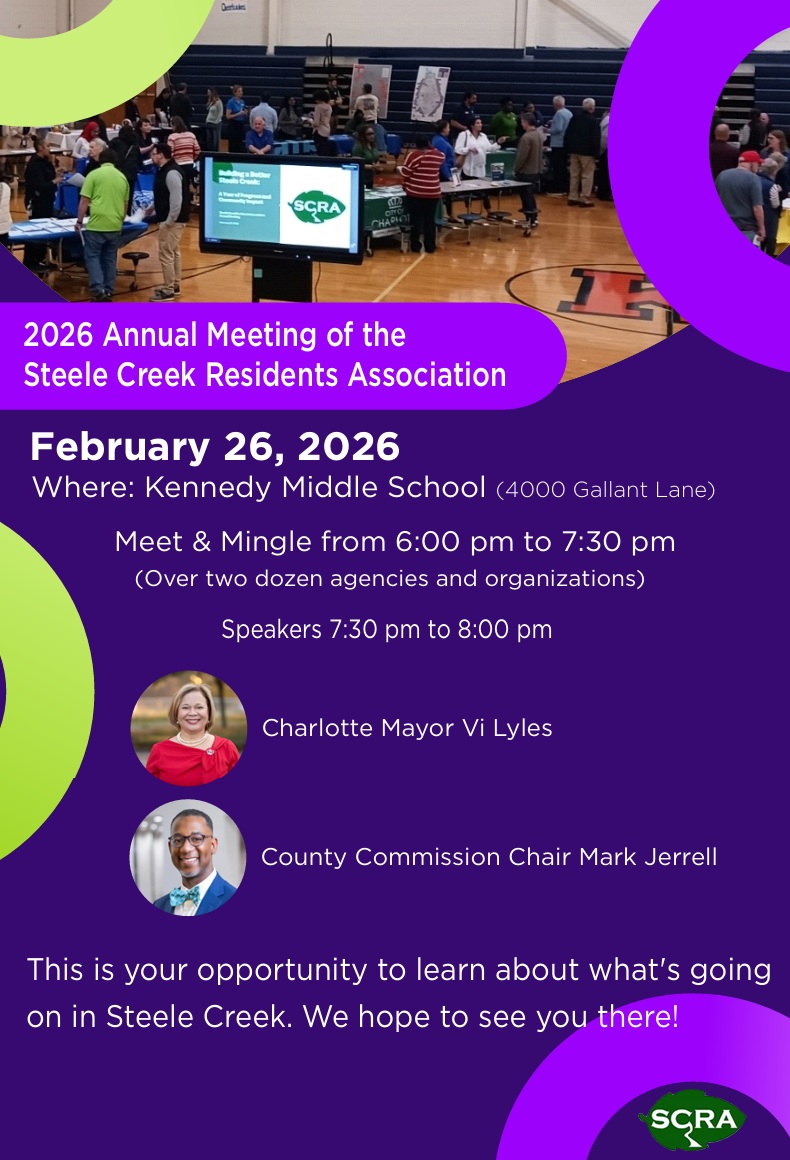 (February 5, 2026) Plan to attend the Steele Creek Residents Association Annual Meeting on Thursday, February 26 at Kennedy Middle School, 4000 Gallant Lane.