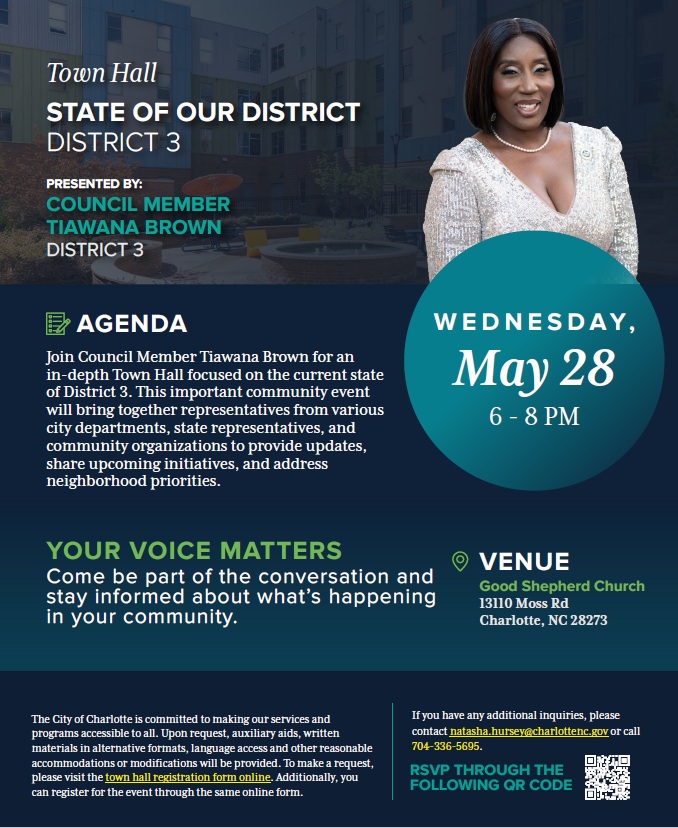 (May 20, 2025) Join Charlotte City Council Member Tiawana Brown for an in-depth Town Hall focused on the current state of District 3. This important community event will bring together representatives from various city departments, state agencies, and community organizations to provide updates, share upcoming initiatives, and address neighborhood priorities.
